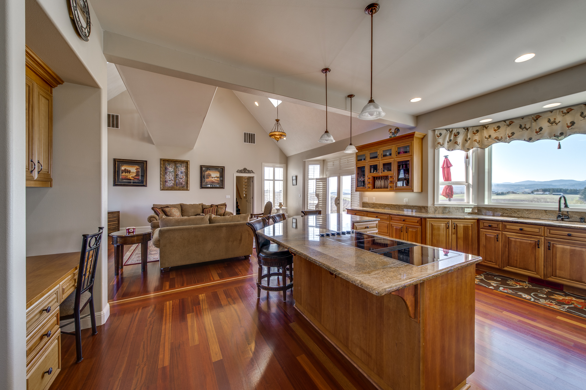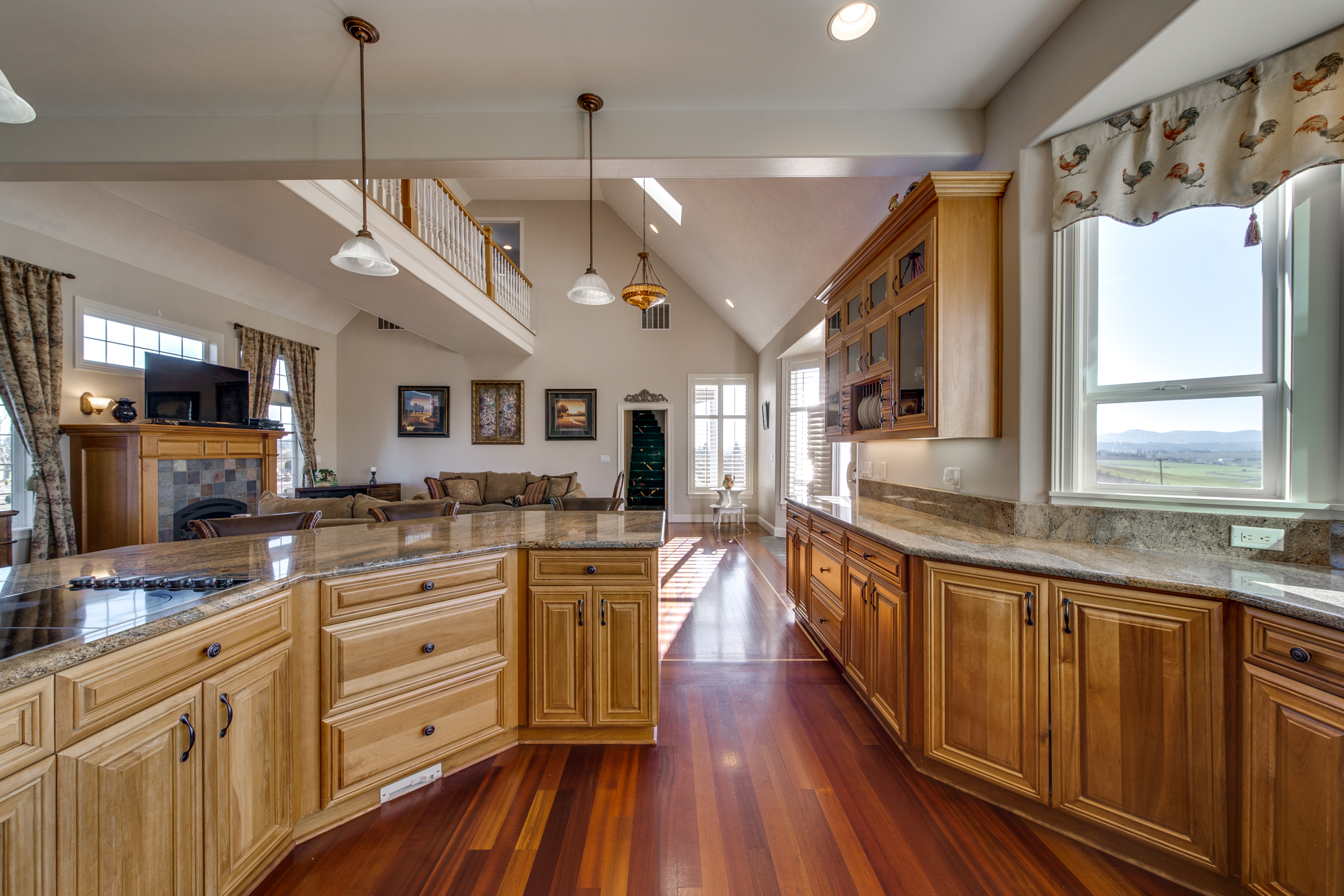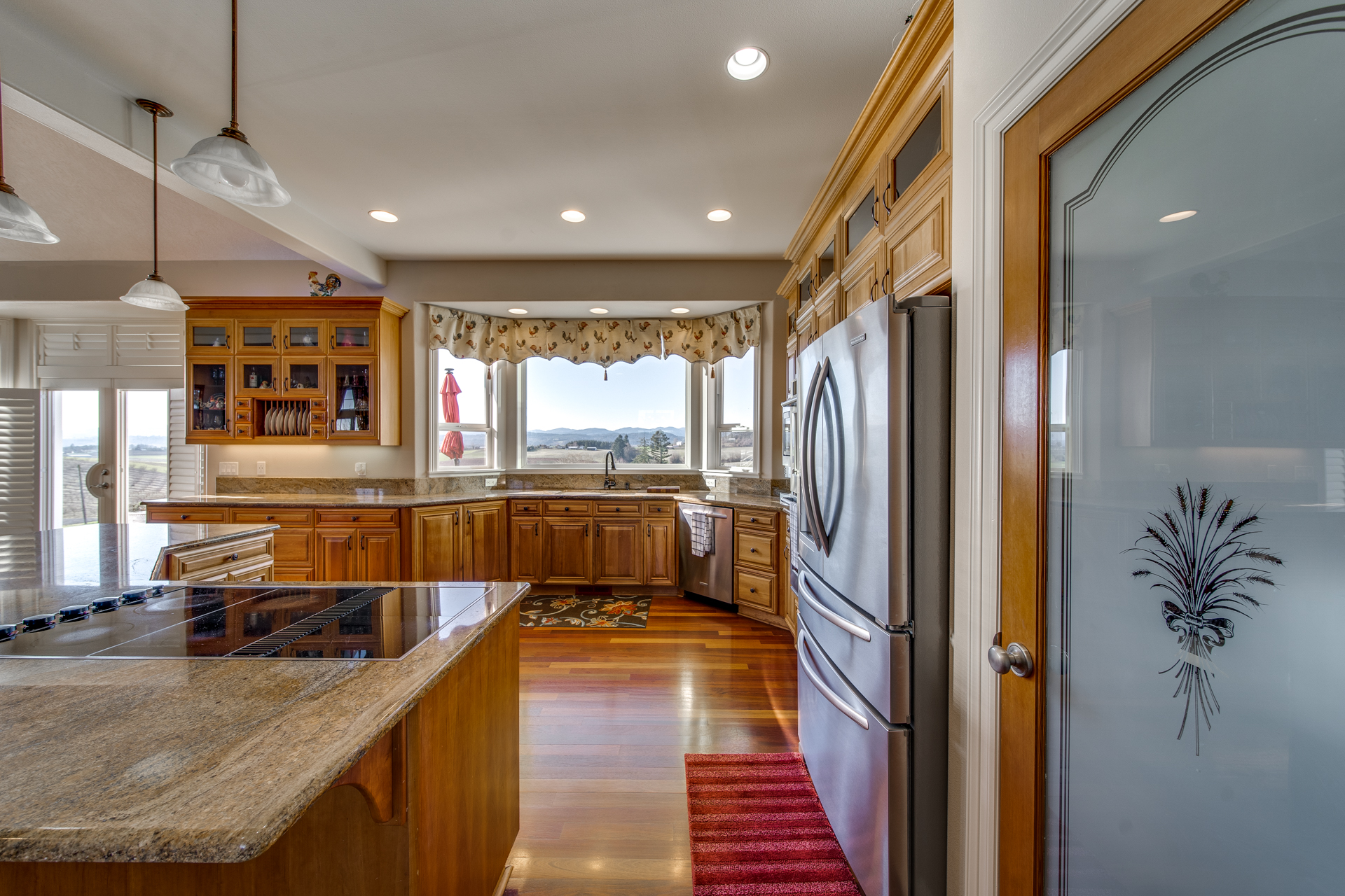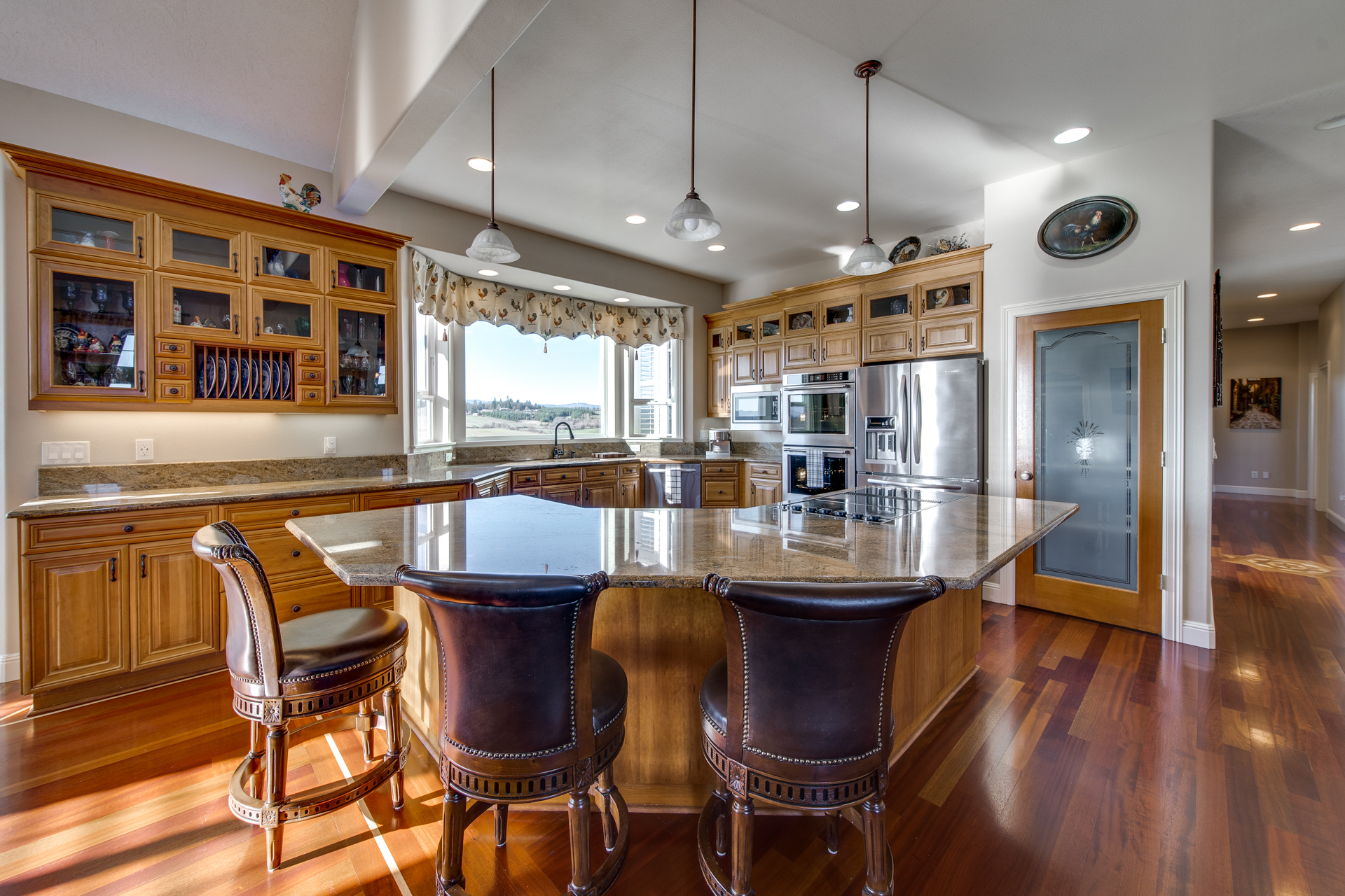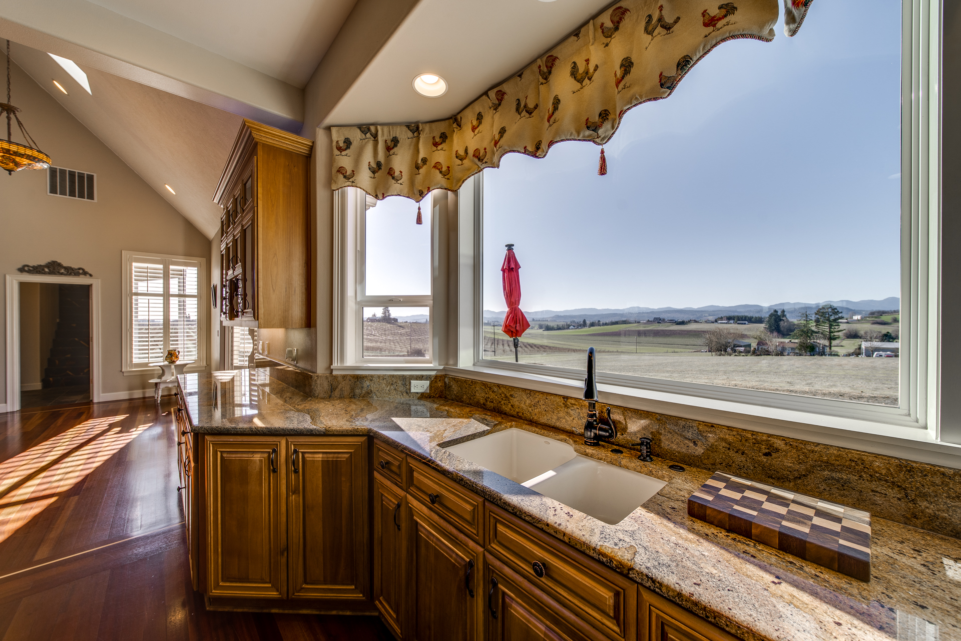 Meticulously built with the intention of maintaining an open concept lifestyle, this home is showered with miraculous views of the Willamette Valley. Upon entering the circle driveway and into the formal entryway, you will quickly notice the lustrous Brazilian cherry hardwood floors adding a subtle touch of warmth to the 5113 square foot home. Enter the living room with its gas fireplace working its embers, and you have a private escape place for conversation and relaxation. The kitchen is lined with cherry cabinets and granite countertops that set the perfect atmosphere for Sunday brunches or buffet-style dinners for the big get-together. The family room is spacious and the dining room offers its own space to make the family feel even closer.